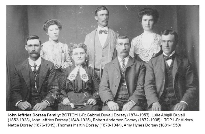 John Jeffries (Jack) DORSEY, the son of Anderson James DORSEY and Mary Polly Harrington DORSEY, was born the 20th day of March, 1848 on a farm in Larue Co. KY. The birthplace of Abraham Lincoln was only eighteen miles from where he was born. He was reared to manhood in his native state, Kentucky, and educated in the public schools there.